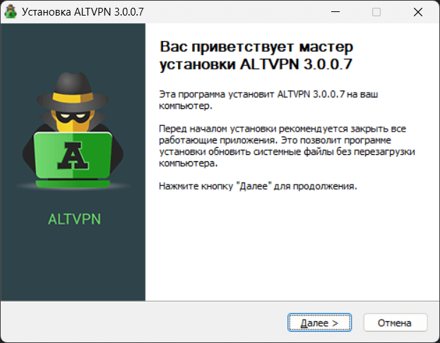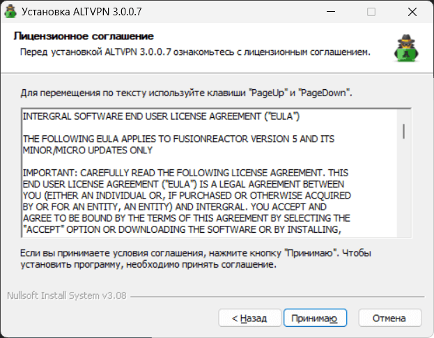 Вам будет предложено ознакомиться с пользовательским соглашением. Нажмите “Принимаю” и на следующем этапе выберите папку, куда будет инсталлирован AltVPN.